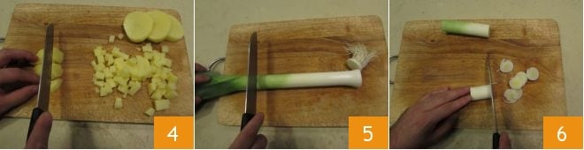 Proceda lavando e secando os legumes. Pegue as batatas e descasque-as, depois corte-as em cubinhos 4 e reserve. Limpe o alho-poró retirando a ponta e a parte verde 5, depois corte-o em rodelas bem finas 6.
