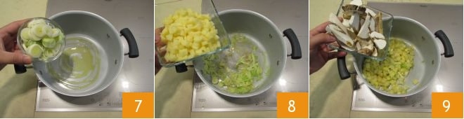 Refogue o alho-poró em uma panela antiaderente com um fio de azeite 7. Quando estiver murcho, adicione as batatas 8 e também os porcini 9. Se preferir, você pode reservar algumas fatias para a decoração final (se decidir fazer isso, salteie-as em uma panela com um fio de azeite, dourando-as por 1 minuto de cada lado).