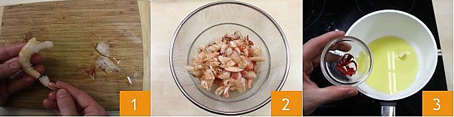 A primeira coisa para preparar a creme de abóbora com camarões é limpar os camarões, retirem a cabeça dos camarões e o exoesqueleto e removam o intestino 1, para um maior aprofundamento clique aqui (Limpeza dos camarões), reservem as cascas 2 e usem-nas para preparar o caldo que servirá para dar sabor à creme. Em uma panela, coloquem o óleo, o dente de alho e a pimenta, deixem dourar por alguns minutos 3