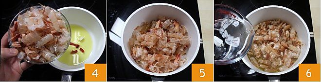 então coloquem também as cascas dos camarões e deixem apurar no óleo 4, depois adicionem o vinho branco, deixem evaporar e acrescentem a água (5-6).