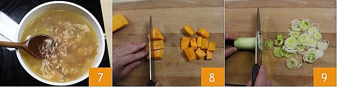 e deixem cozinhar por cerca de meia hora. Enquanto isso, ocupem-se da abóbora, cortem-na em fatias, retirem a casca e cortem-na em pedaços pequenos, de preferência todos do mesmo tamanho 8. Então limpem o alho-poró, retirando a parte verde e as folhas mais externas, depois cortem em fatias 9.