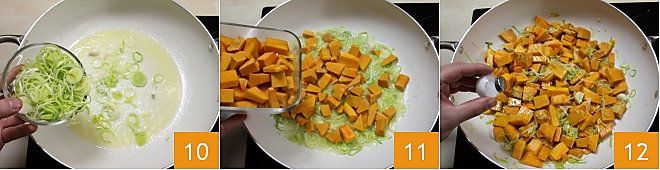 Então, em uma panela grande, de preferência larga e rasa, coloquem a derreter a manteiga e juntem os alhos-porós 10, deixem amolecer por alguns minutos e depois adicionem a abóbora 11. Salguem e apimentem e deixem cozinhar por cerca de dez minutos 12,