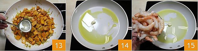 adicionando aos poucos o caldo de crustáceos 13 filtrado. Em outra frigideira antiaderente, aqueçam o óleo com outro dente de alho 14 e grelhem rapidamente os camarões limpos previamente 15
