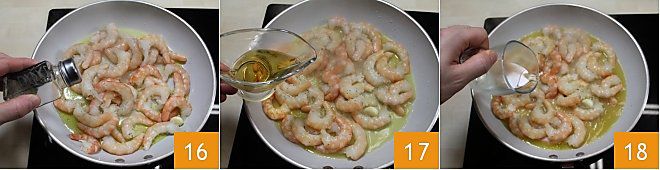 salguem e apimentem 16 e reguem com conhaque 17 e com vinho branco 18 e deixem evaporar. Deixem apurar por alguns minutos e depois apaguem o fogo.