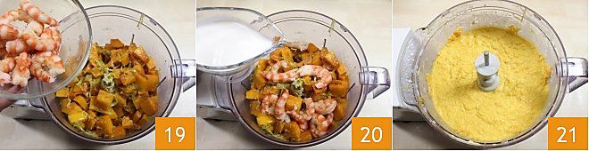 Quando a abóbora estiver completamente amolecida, transfiram para um mixer com os camarões 19, adicionem o creme de leite 20 e batam até obter um creme 21.