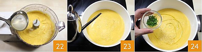 adicionem uma concha de caldo se quiserem obter uma consistência mais cremosa e não muito líquida 22. Coloquem novamente a creme na panela, ajustem, se necessário, o sal e a pimenta, adicionem um fio de óleo 23 e acrescentem a cebolinha picada 24. Está pronta sua creme de abóbora com camarões quente! Decorem com os camarões restantes polvilhando-os com uma fina picada de cebolinha e, eventualmente, uma pitada de pimenta. Coloquem os camarões na frigideira com um fio de óleo e alho, batam a creme com um pouco de caldo se necessário.